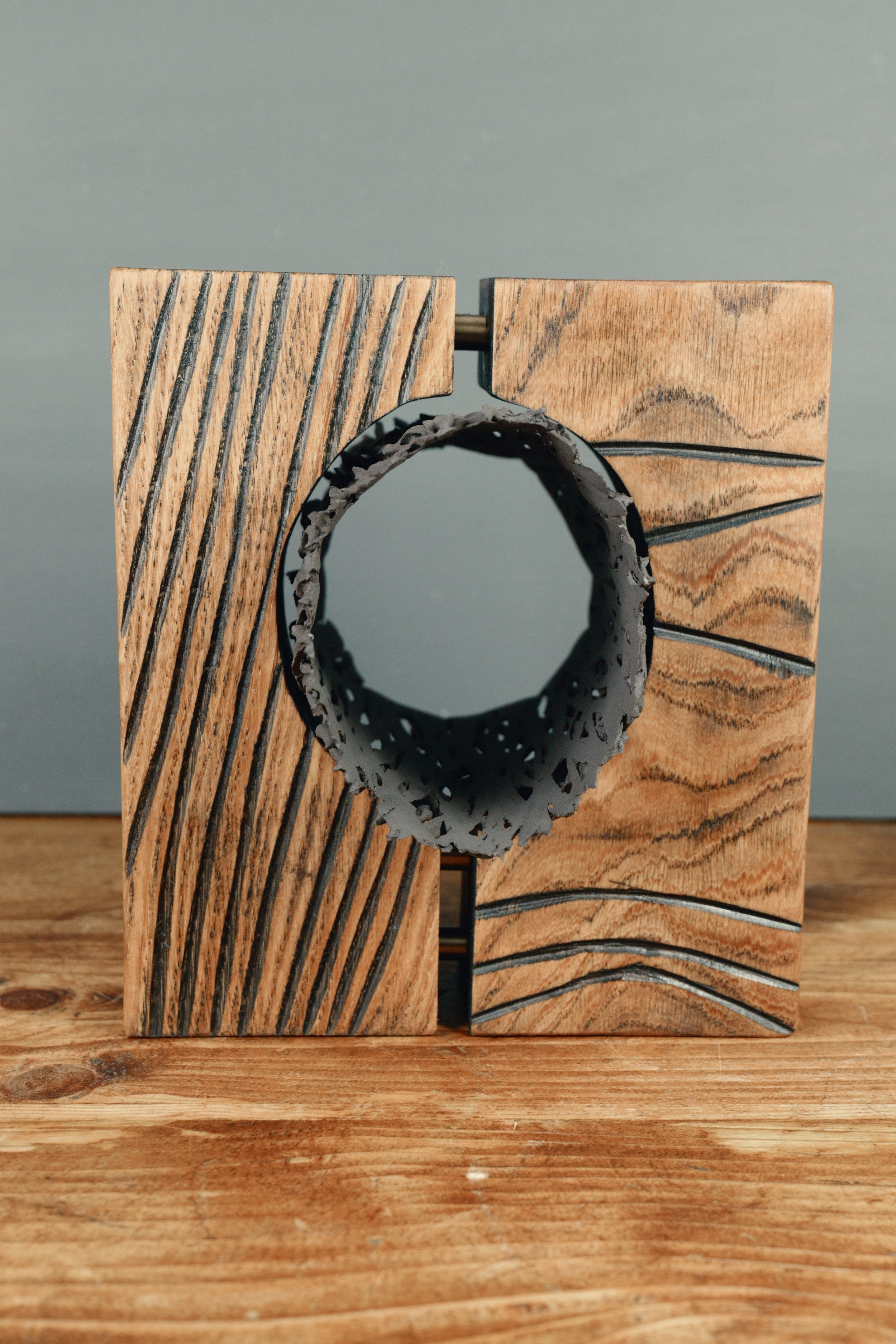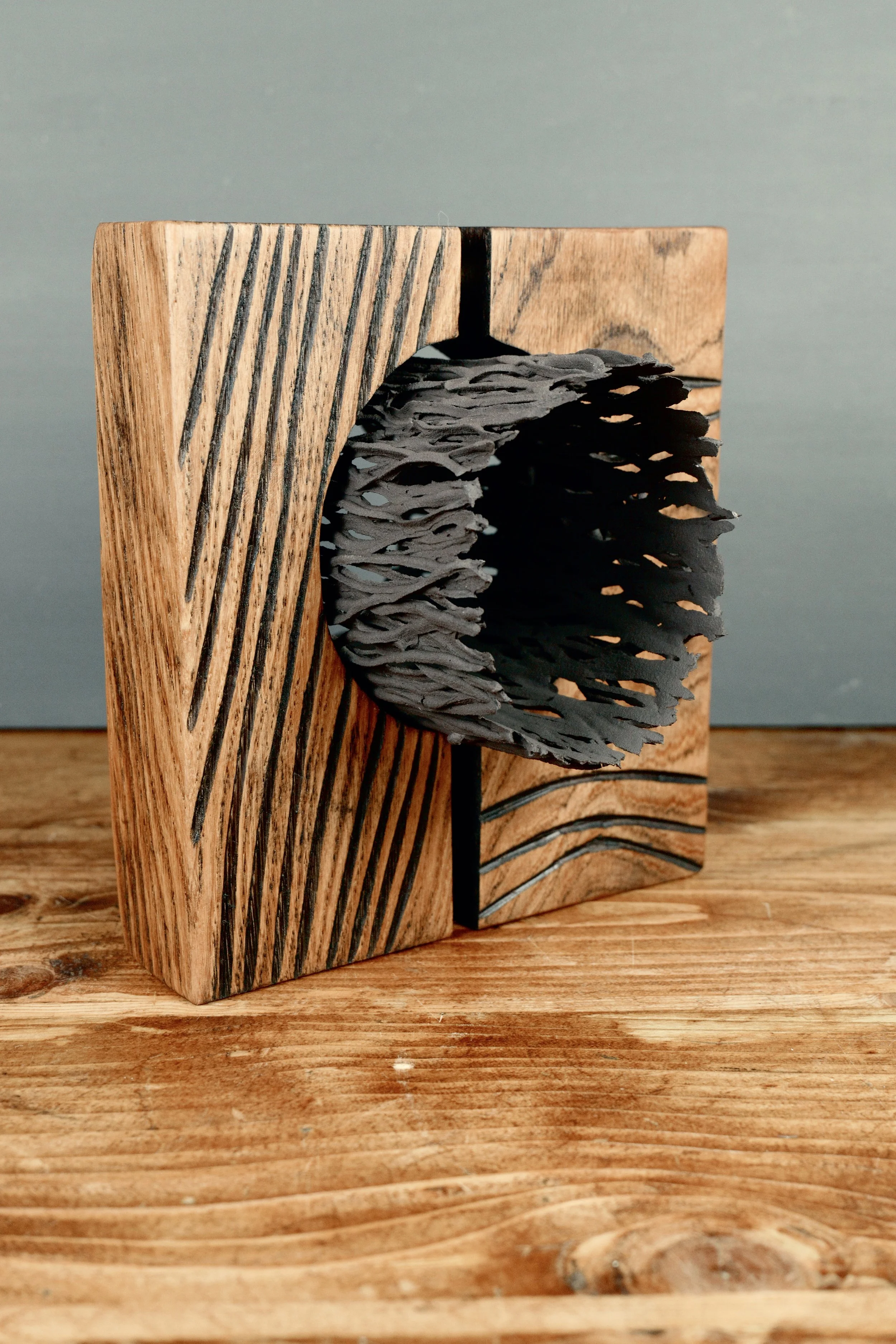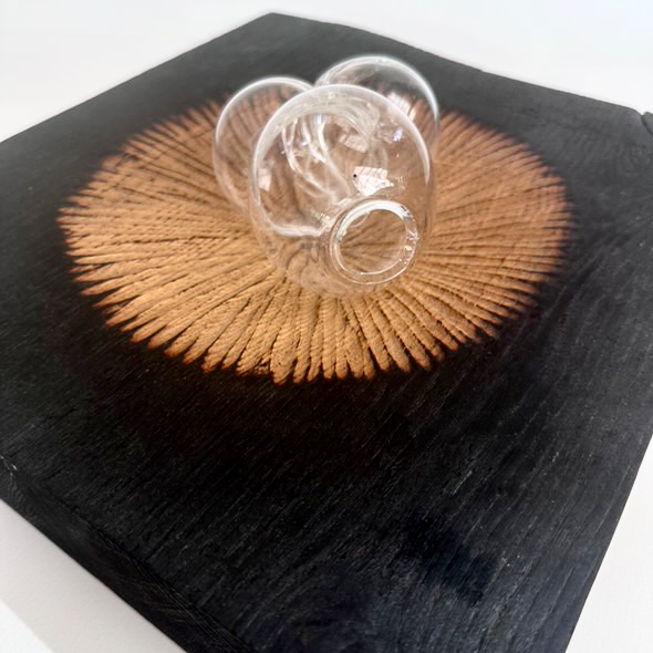 Unlike the fragility of the glass, the wooden form underneath offers stability and containment. Whilst the glass represents air elements, the wood is grounded in the earth.