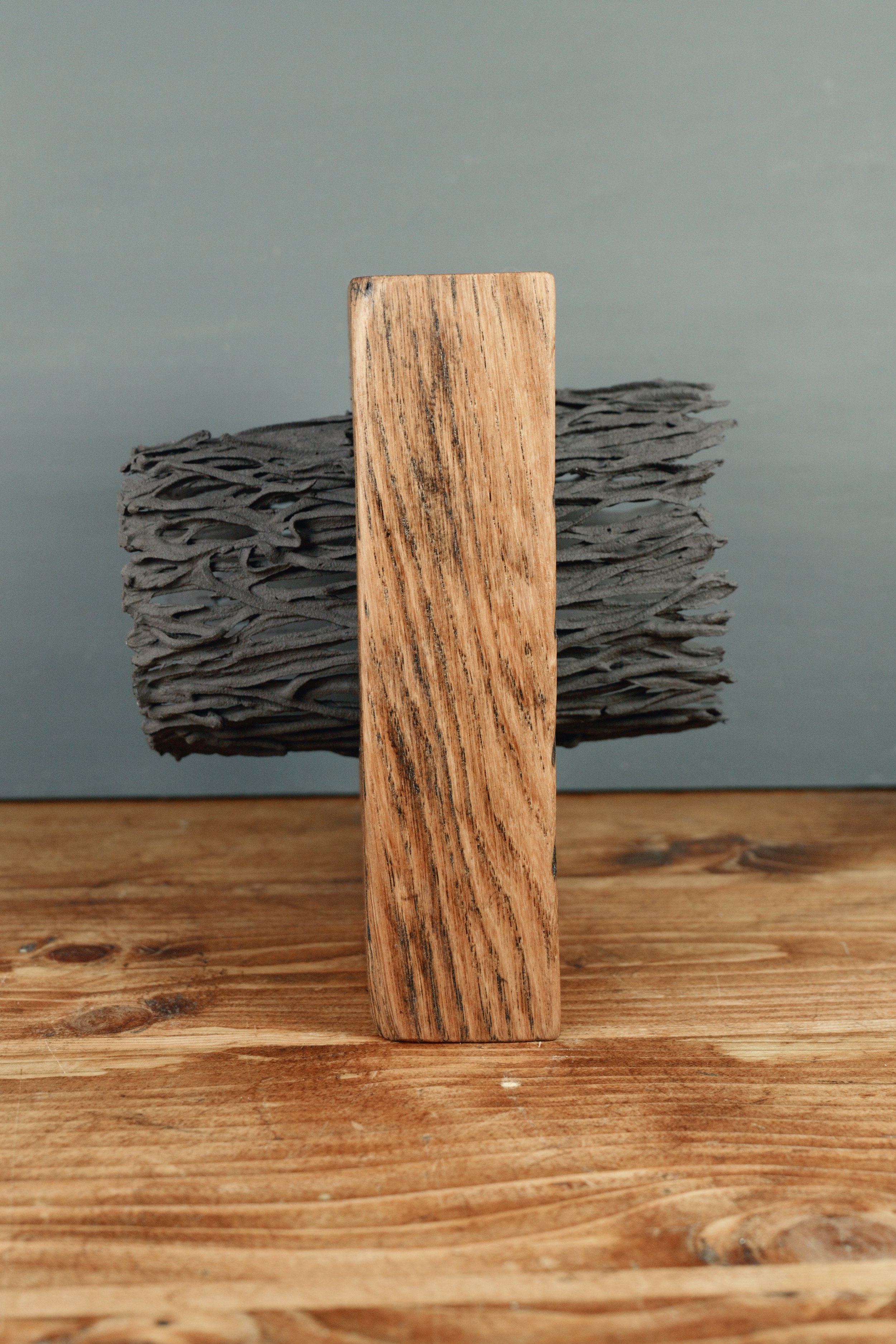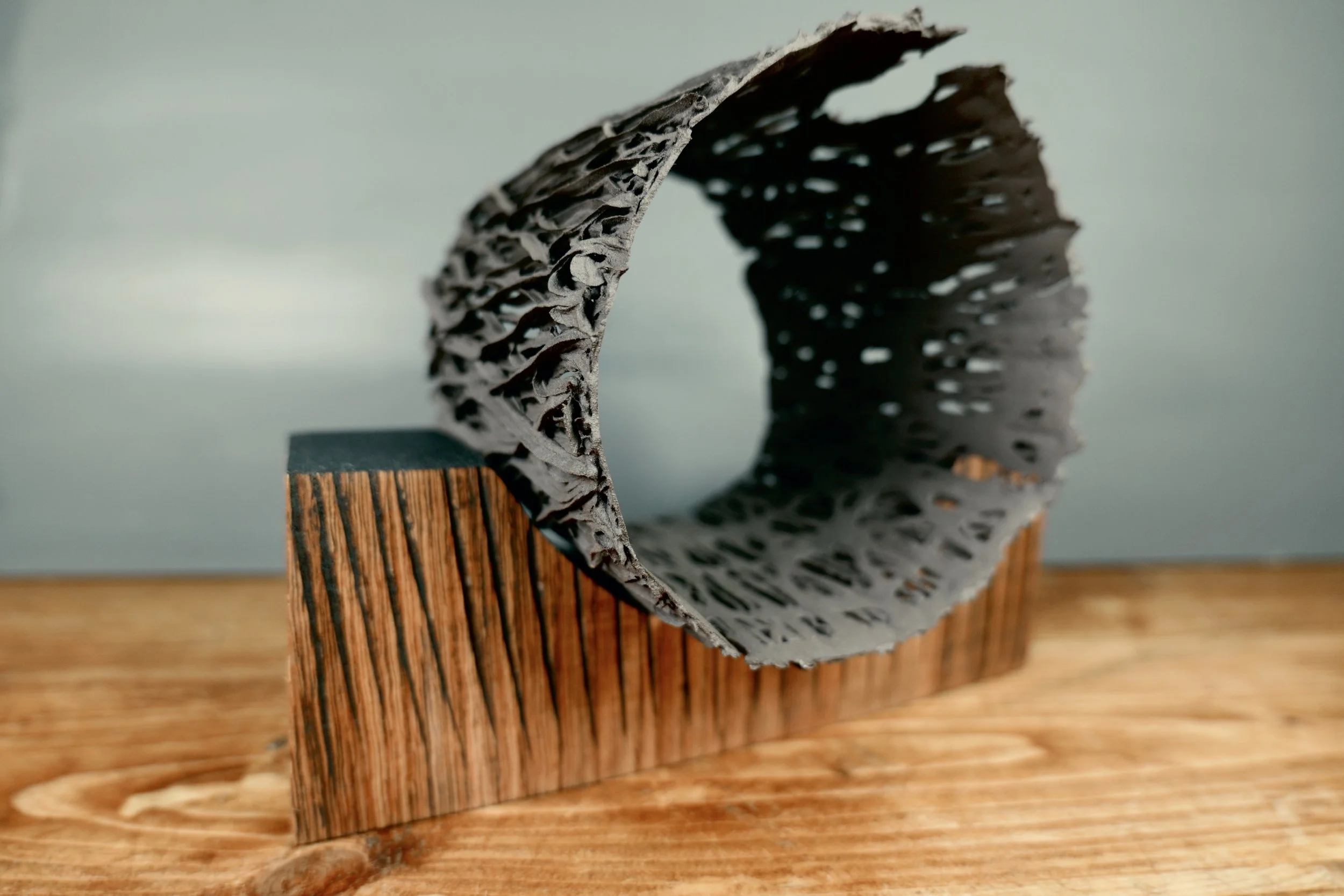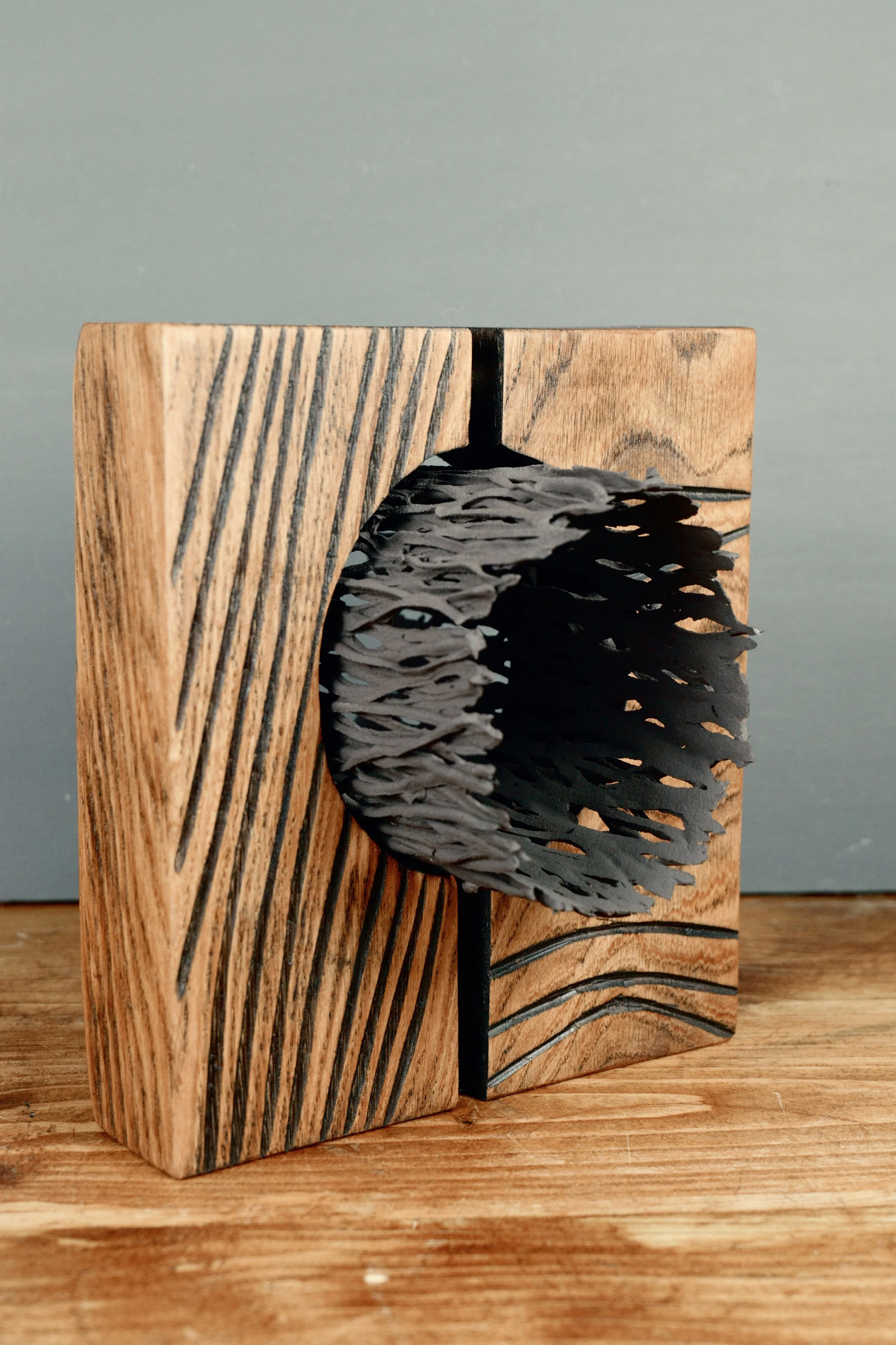 Unlike the fragility of the glass, the wooden form underneath offers stability and containment. Whilst the glass represents air elements, the wood is grounded in the earth.
