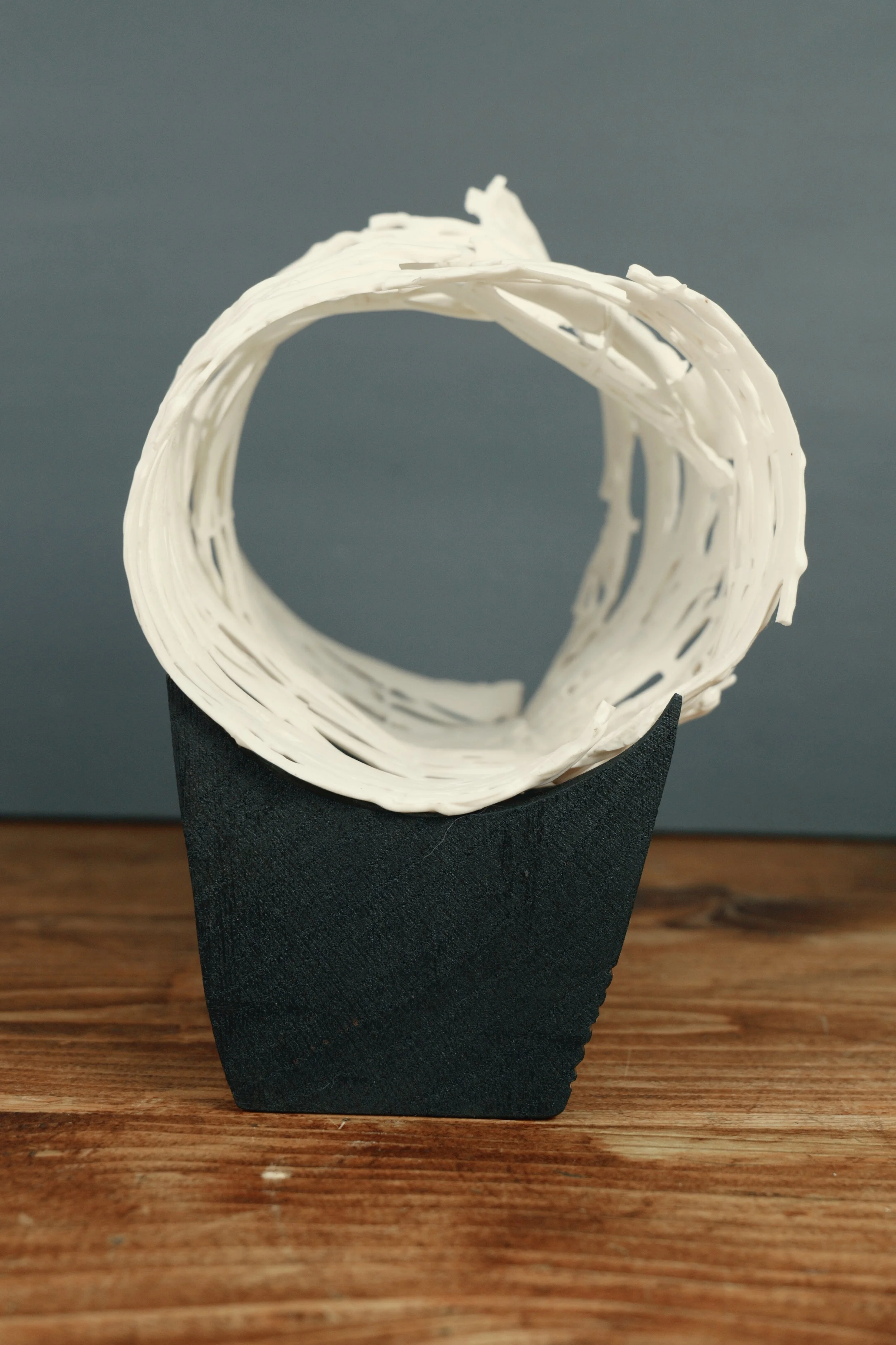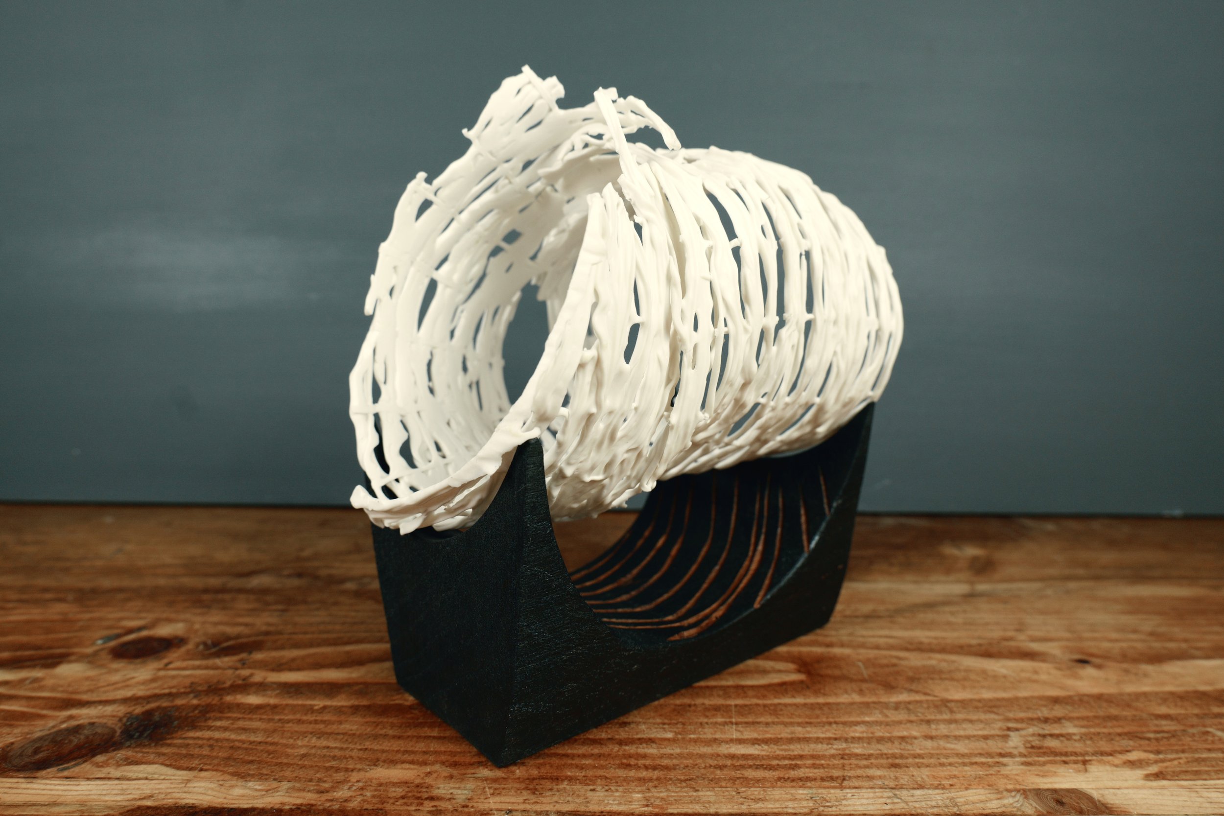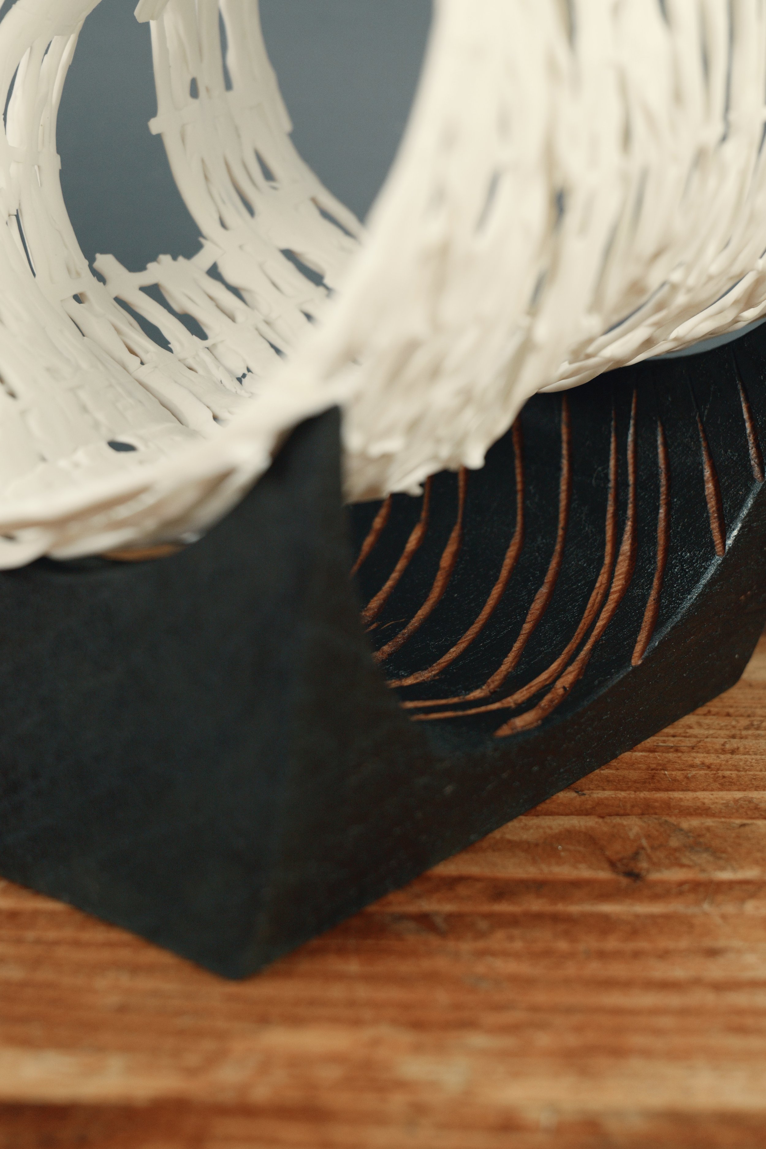 Designed to co-exist alongside the ceramic shapes and at times act as a pedestal, the two materials are juxtaposed yet also connected.