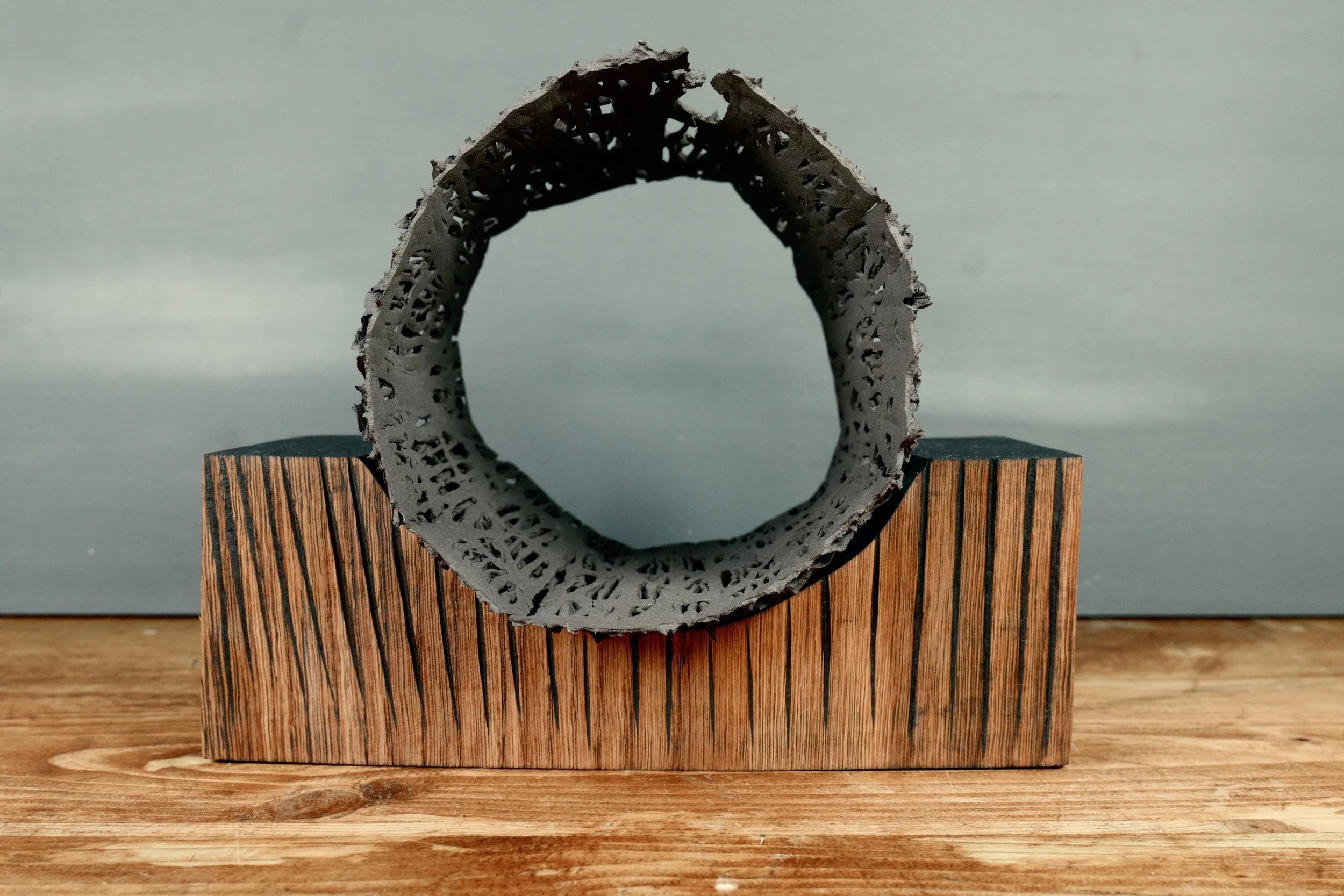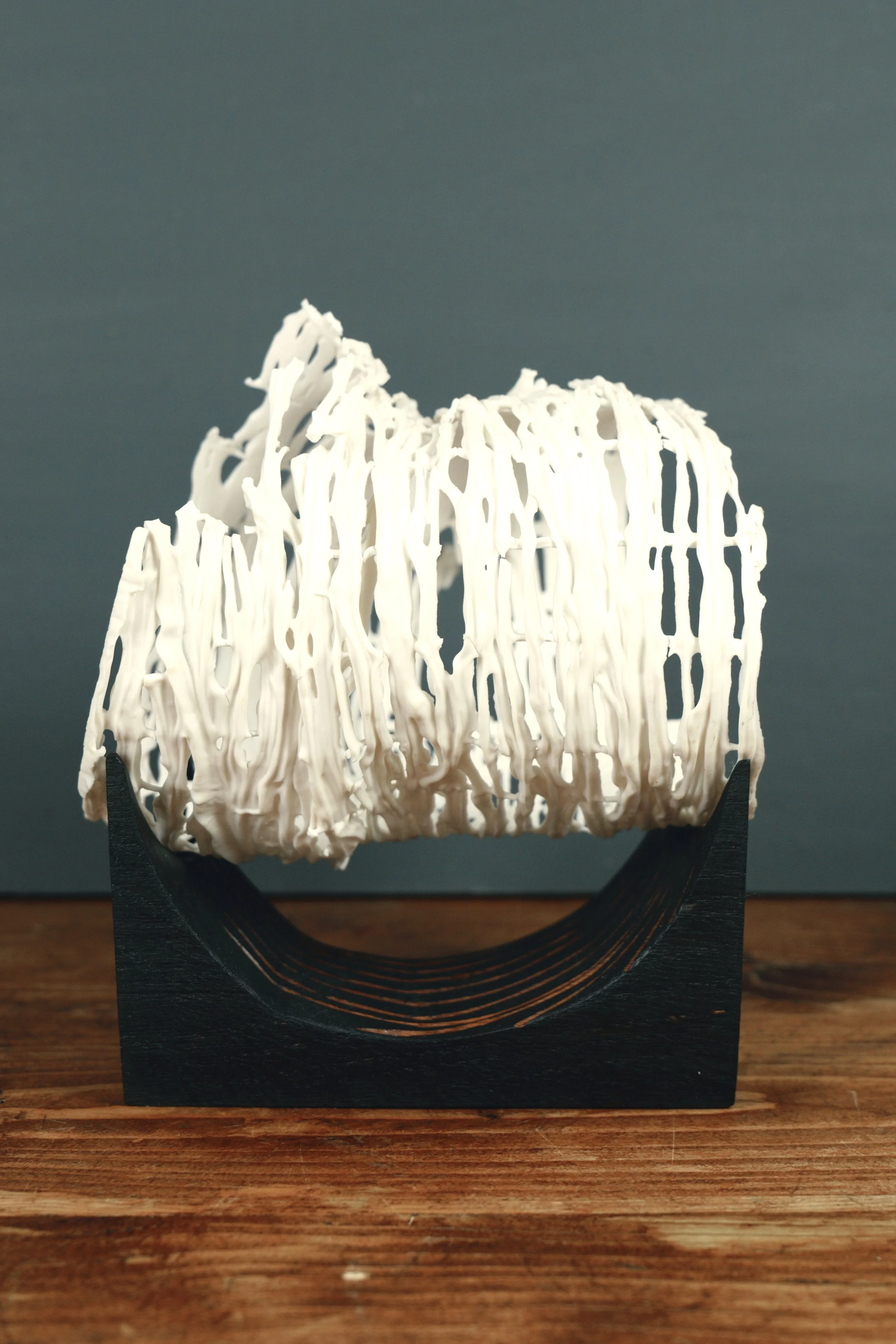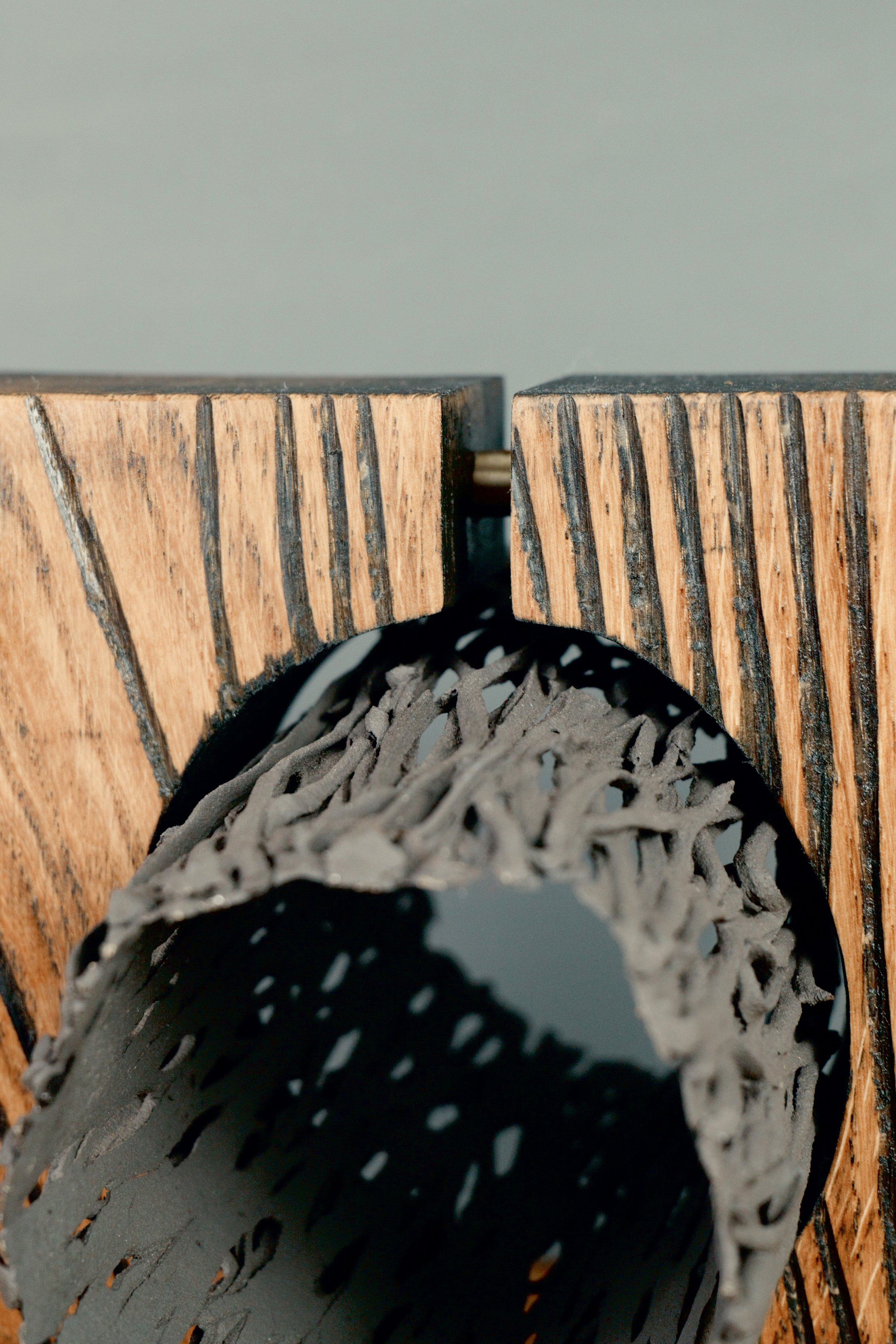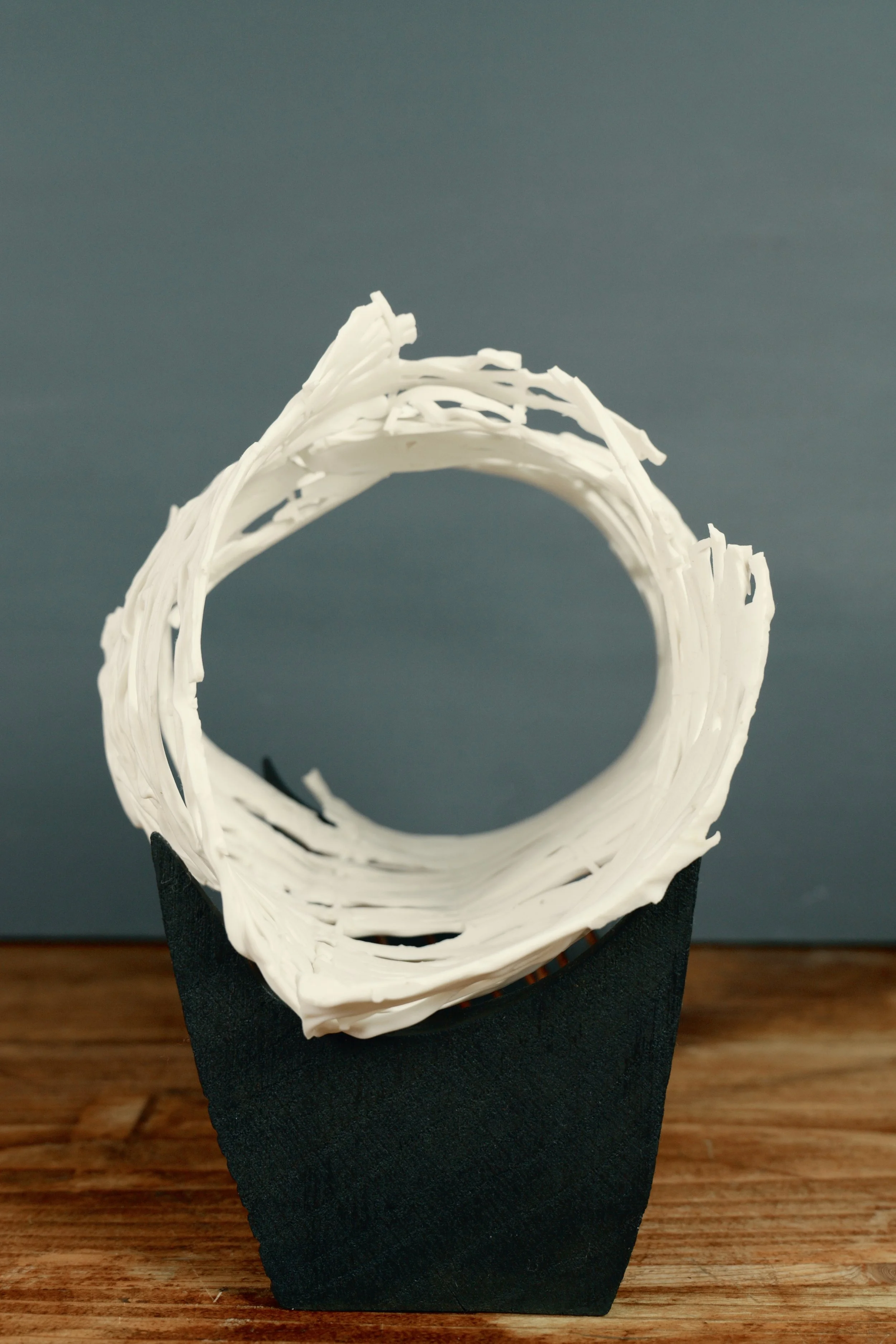 Designed to co-exist alongside the ceramic shapes and at times act as a pedestal, the two materials are juxtaposed yet also connected.
