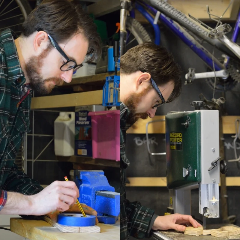 To start the first thing I did was to find my roll of tape then I drew around the center on to a piece of wood. I then took the wood to the bandsaw and cut out the circle.