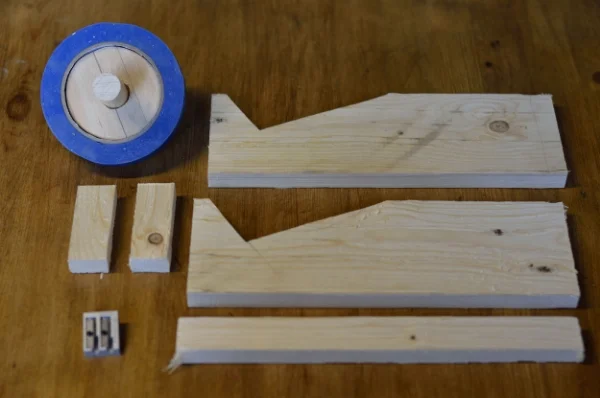 Using the bandsaw I cut out all the pieces. I cut a piece of dowel to the width I planned the dispenser to be. I drilled I hole in the center of the round bit of wood and fitted the dowel in.