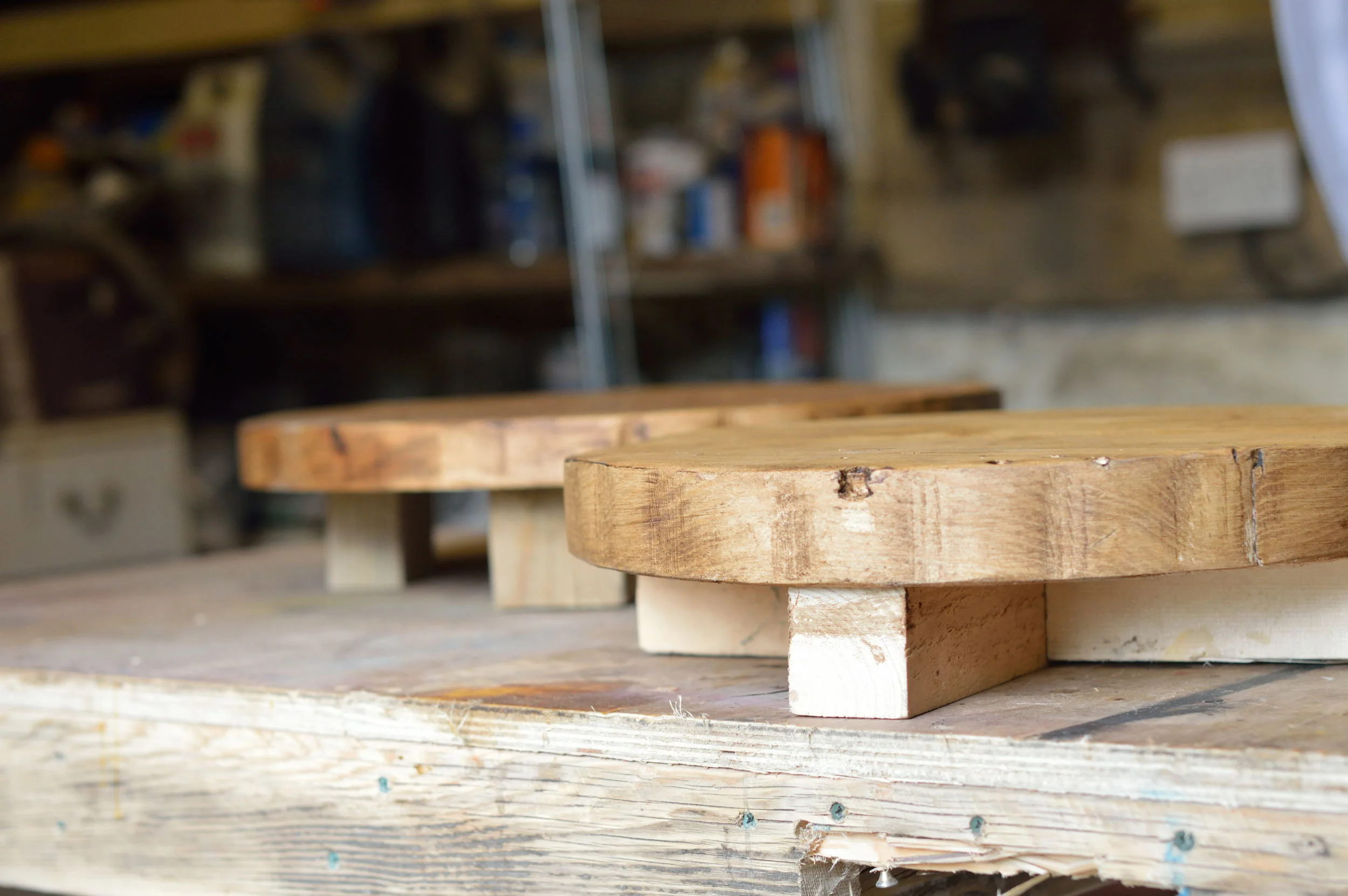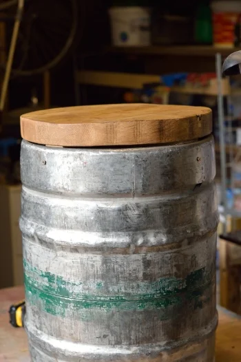 With the keg opened I gave it a good wash out and left it to dry as I made tops and bottoms for it. As this table was only going in the workshop I made the top and bottom out of old scraps a had knocking about to go with the clearing out theme of this project. I glued and clamped the wood together then when dry I cut the circles out on the band saw. I gave the disks a rough sand as I was keeping it all rustic. I added some wooden noggins the the underside of the wood. These would slip inside the lip of the keg allowing me to screw into them.