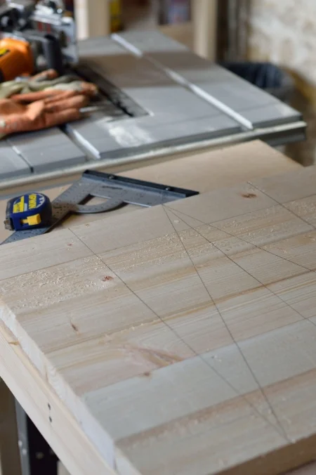 I laid the planks together in the shape the table top would be. Then drew three lines across to make where I would drill holes for the dowels. I drew a triangle on the wood to make it easy to line them back up again.