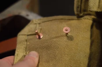 To close the bag I used Sam Brown studs that I screwed onto leather then using copper rivets attached the leather to the bag.